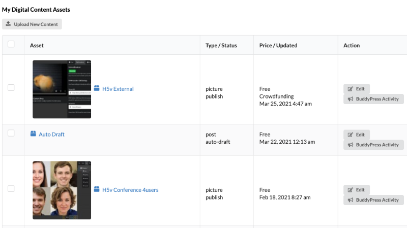 - Content Upload page enables providers to upload videos, pictures and documents from a single form (integrates Downloads, Video Share VOD](https://wordpress.org/plugins/video-share-vod/ „Video Share / Video On Demand Script”), Picture Gallery )